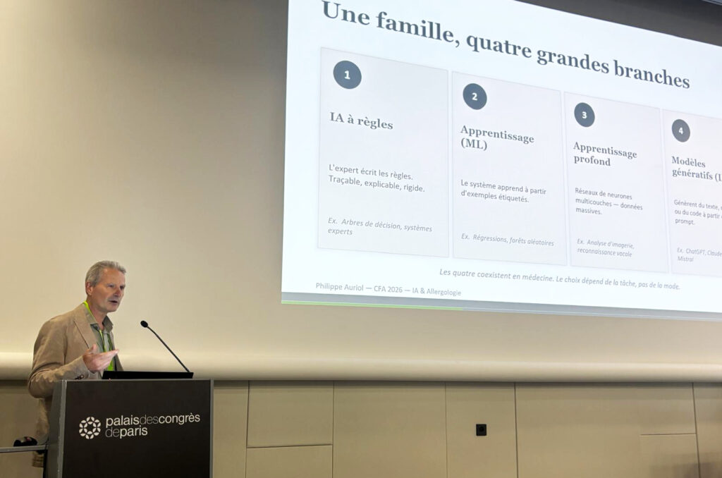 Et parce que la maladie allergique s’aggrave avec le temps, selon les allergologues, les moyens pour l’enrayer s’adaptent et s’accélèrent. L’allergologie se digitalise, les stratégies thérapeutiques se personnalise. Dans la communication du Dr Philippe Auriol, on a découvert les enjeux de l’intelligence artificielle pour améliorer les pratiques, aller plus vite et mieux avec des informations fiables. Il nous a parlé d’iAtchoum, Cette Intelligence artificielle encapsulée dans le moteur de recherche du site www.allergique.org donne trois niveaux d’information : connaissance généraliste, regard d’expert en allergologie moléculaire, et listes d’articles à fouiller pour aller plus loin.